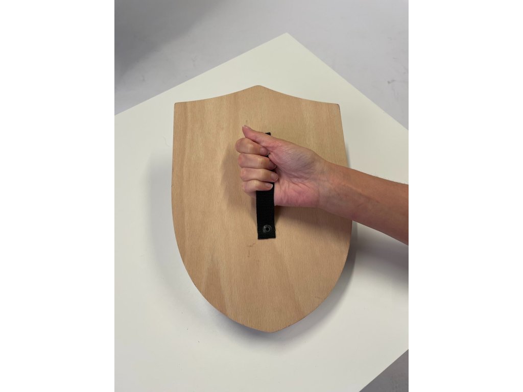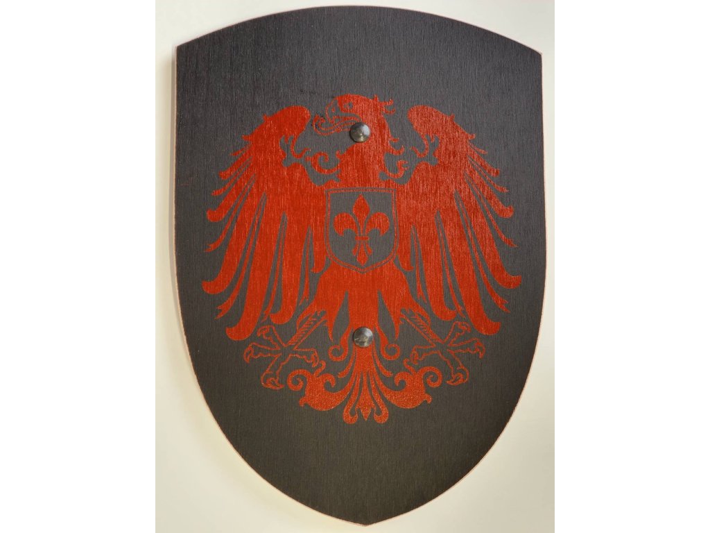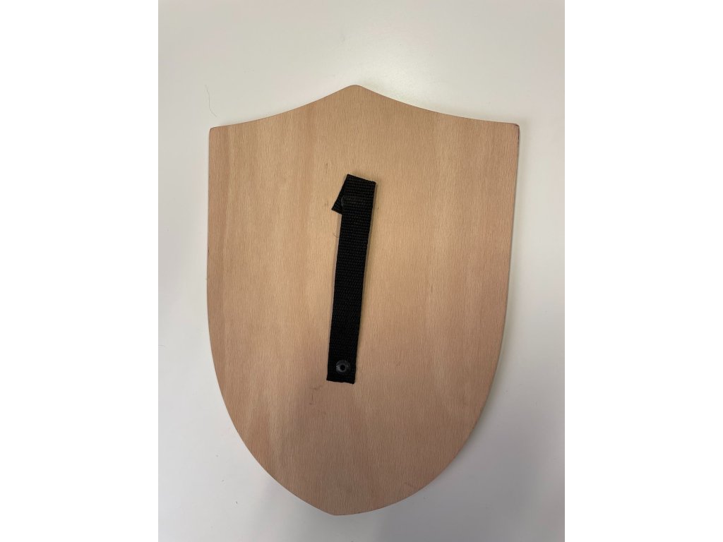 Drevená hračka z bukovej preglejky v tvare malého štítu s čiernou potlačou a motívom červenej orlice. Na zadnej strane je jeden popruh, ktorým sa štít drží. Možnosť výberu z dvoch prevedení tvaru štítu - Klasik alebo Bojovník.